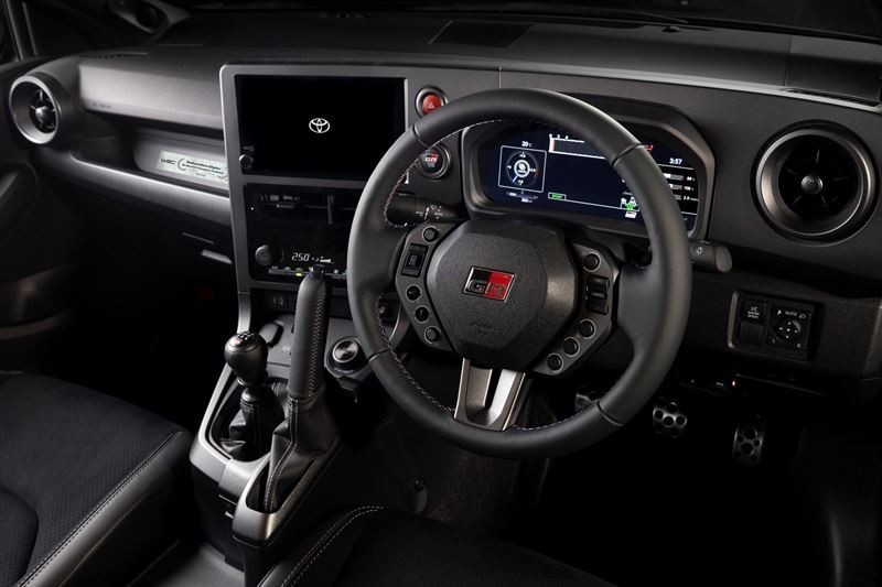 Även interiören har fått en tydlig rallyprägel. Ratten har blivit mindre och fått ny knappdesign inspirerad av GR Yaris Rally2. Söm i rött, blått och grått följer upp trikolortemat.
