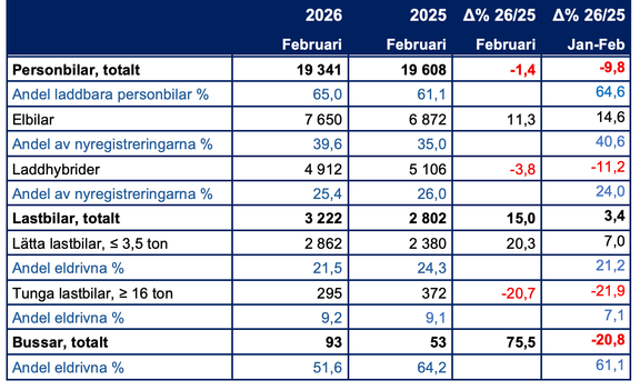 I februari 2026 uppgick andelen laddbara personbilar till 65 procent. Hittills i år har personbilsmarknaden gått ner med 10 procent, jämfört med 2025.